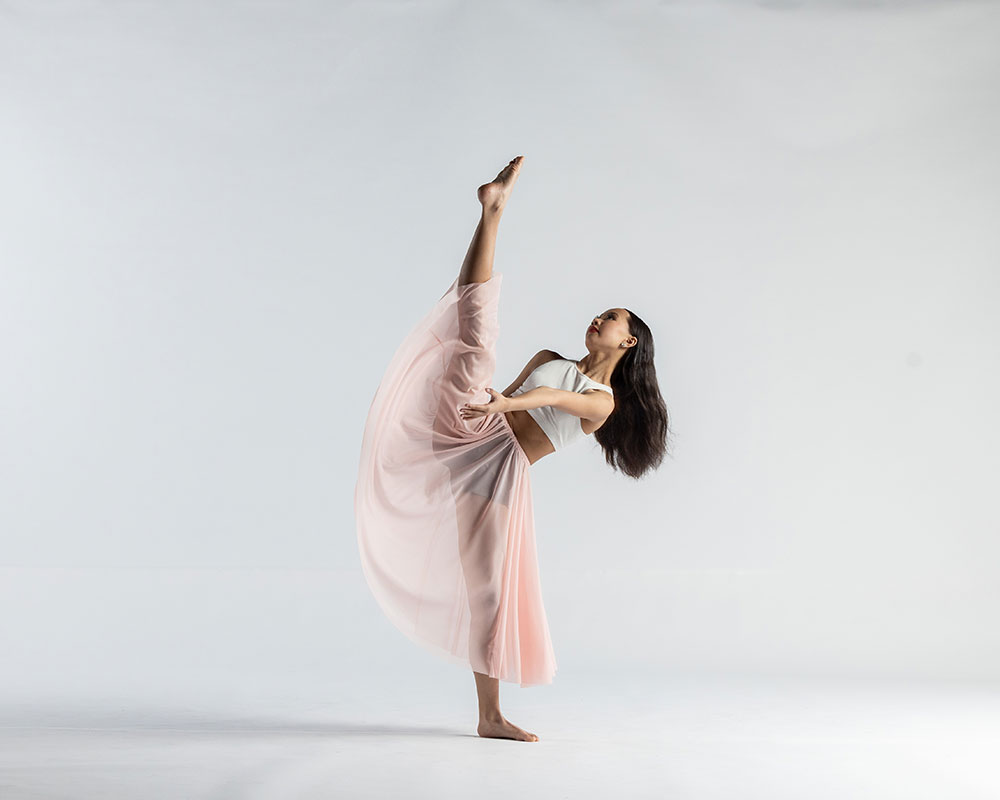 A dancer in a flowing pink skirt and white top performs a standing split, lifting one leg high with elegant balance and control.